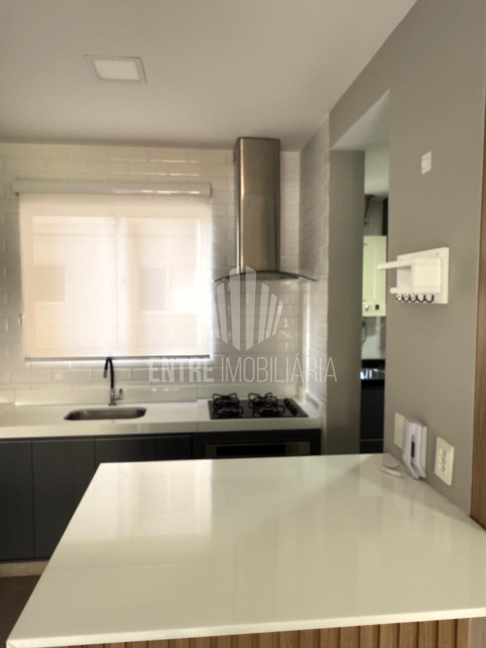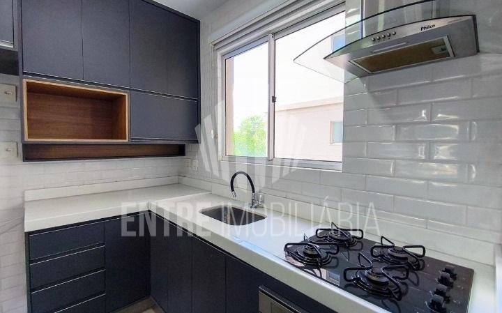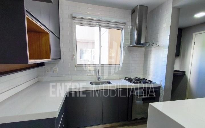 Cozinha americana com ilha, armários planejados, cooktop, forno e coifa. Aquecimento a gás.