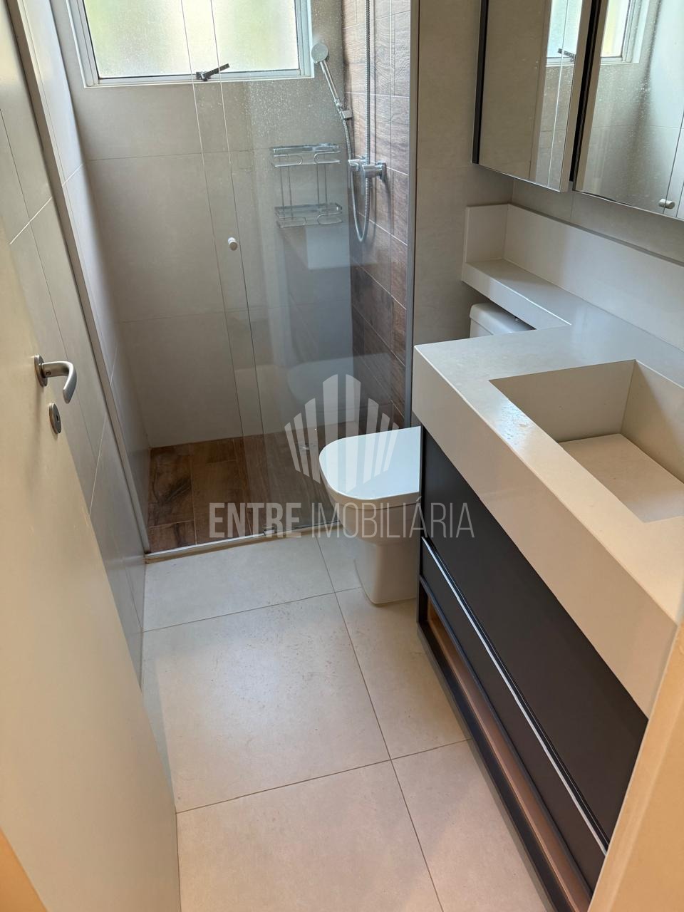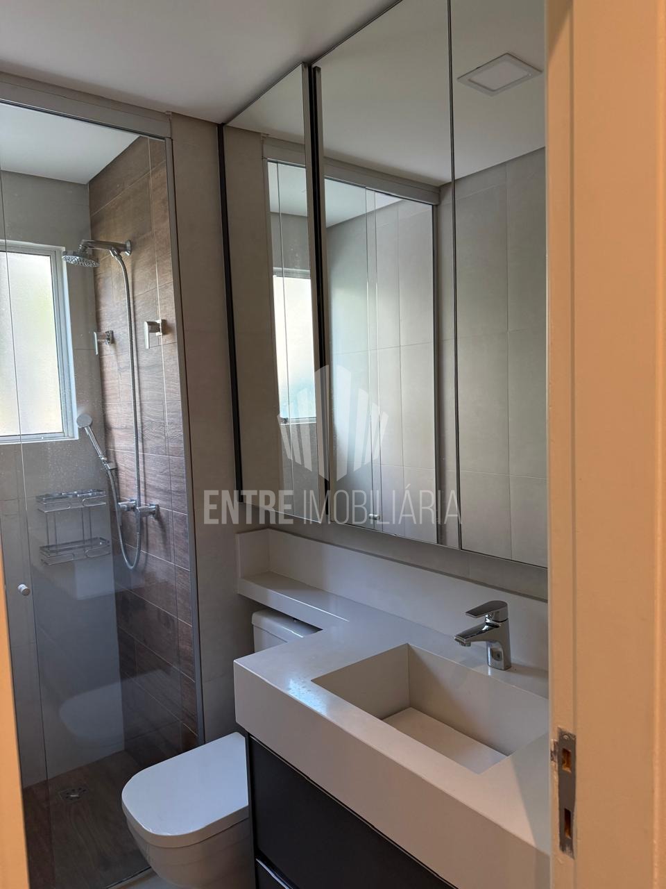 Banheiro social com armários superiores e inferiores
