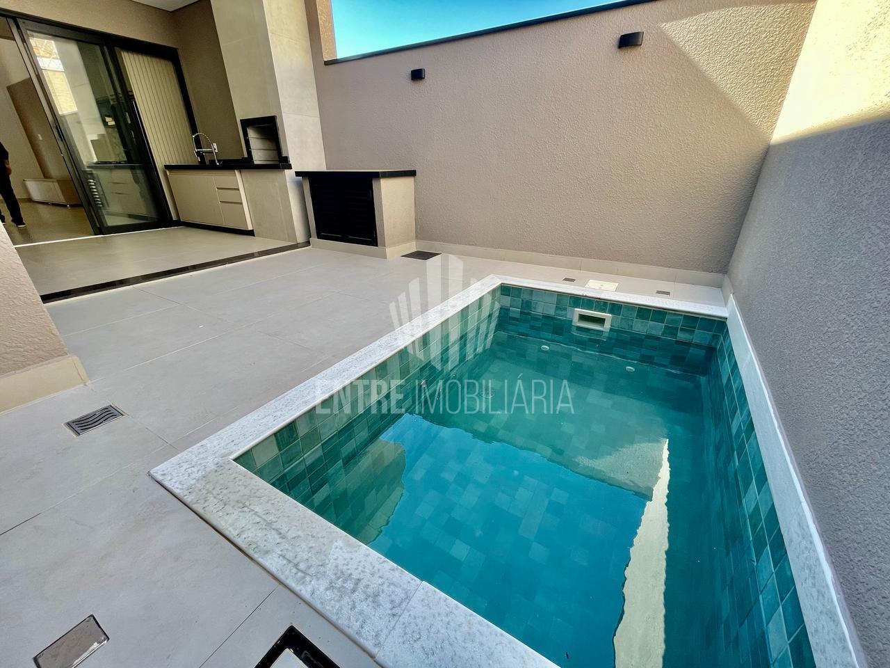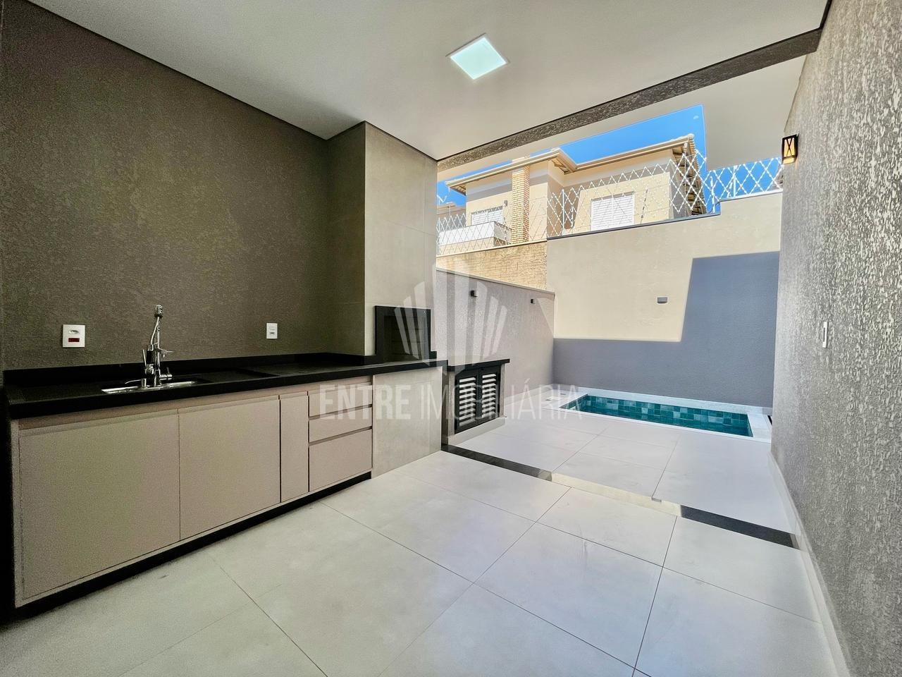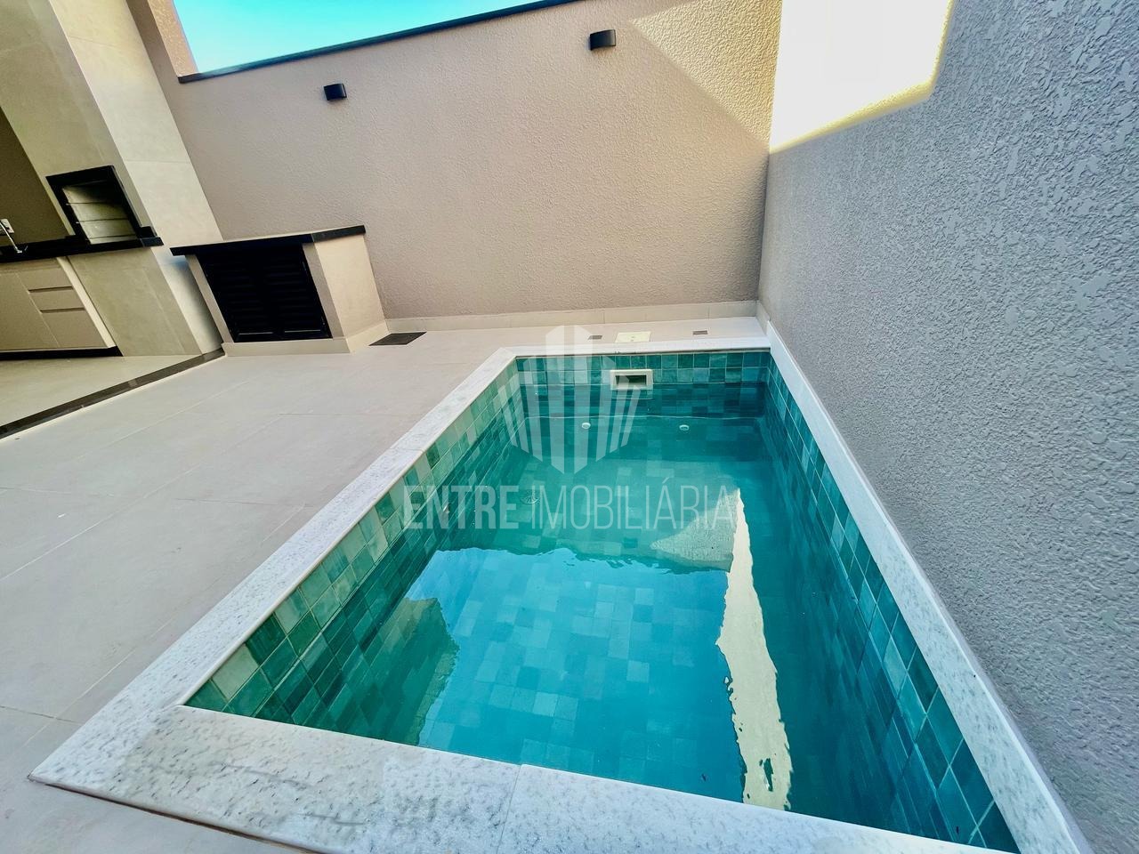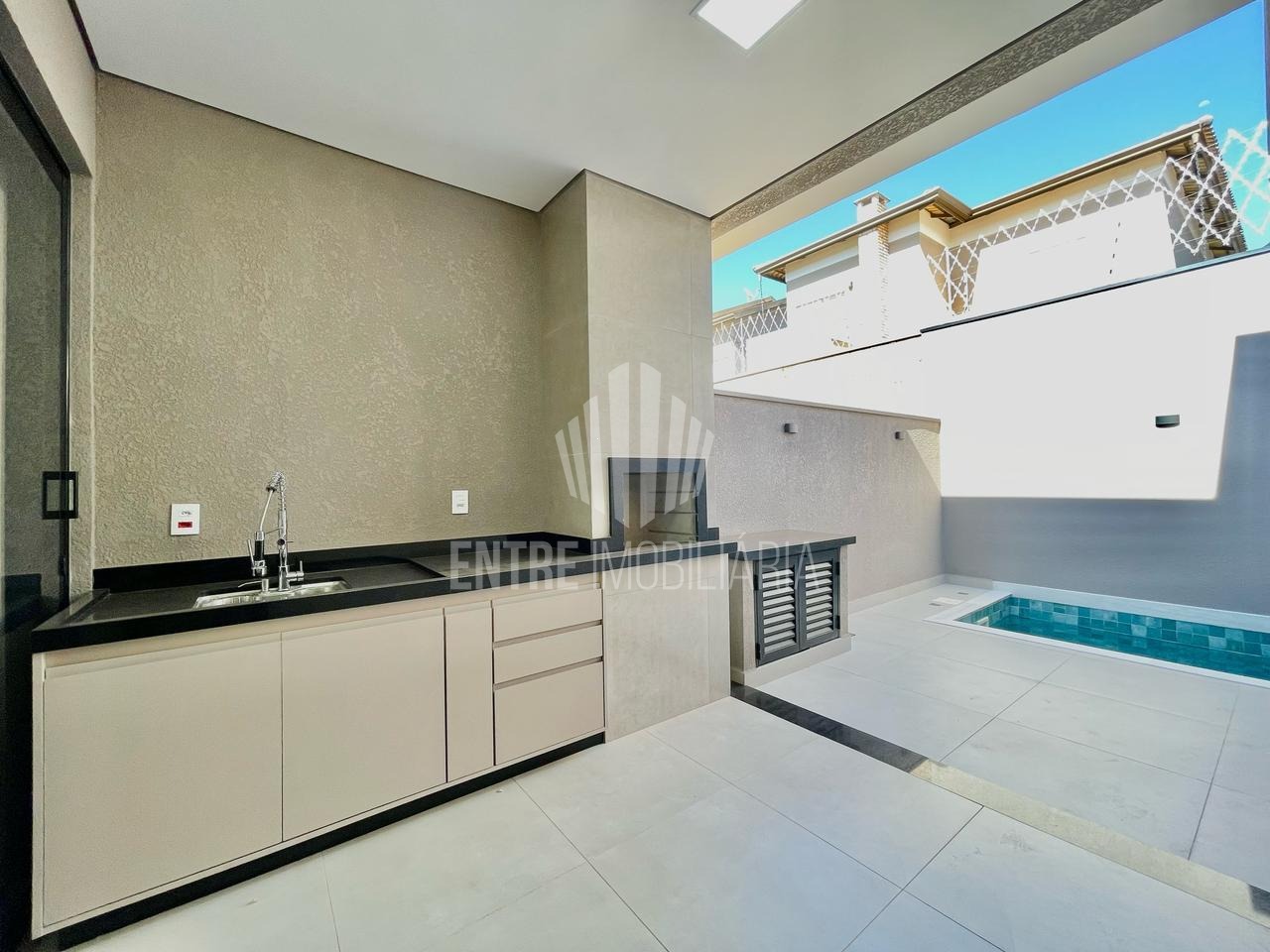 Espaço gourmet com churrasqueira ao lado da piscina.