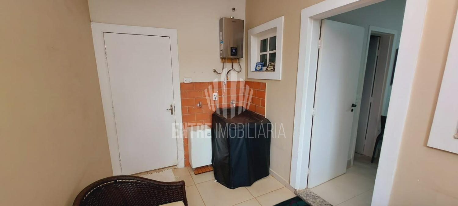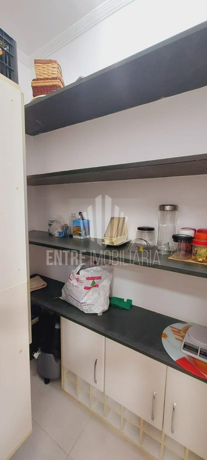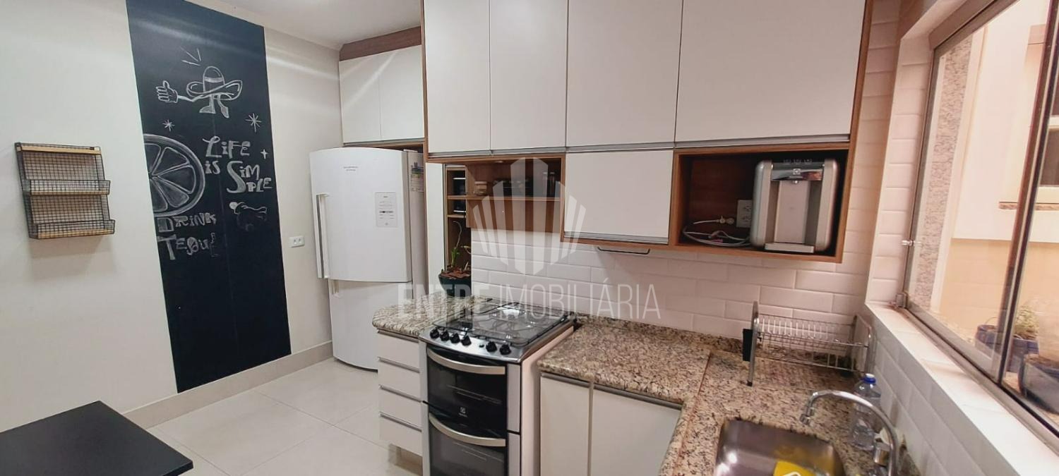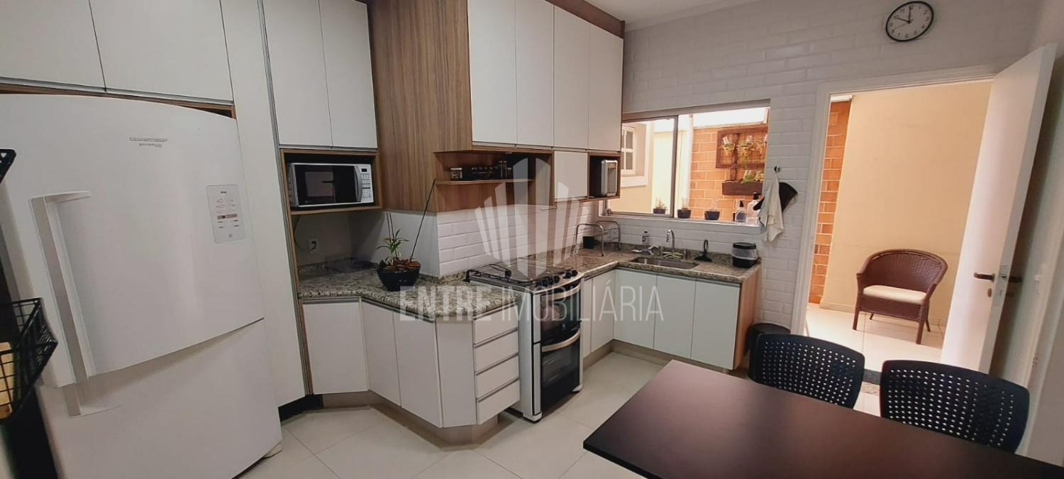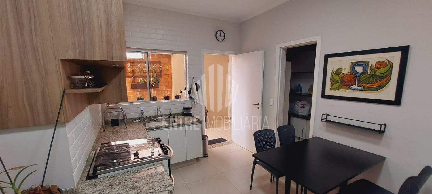 A cozinha fechada e planejada dispõe de armários, despensa e uma prática mesa de apoio. A casa também conta com área de serviço funcional e aquecimento a gás, proporcionando mais conforto no dia a dia.