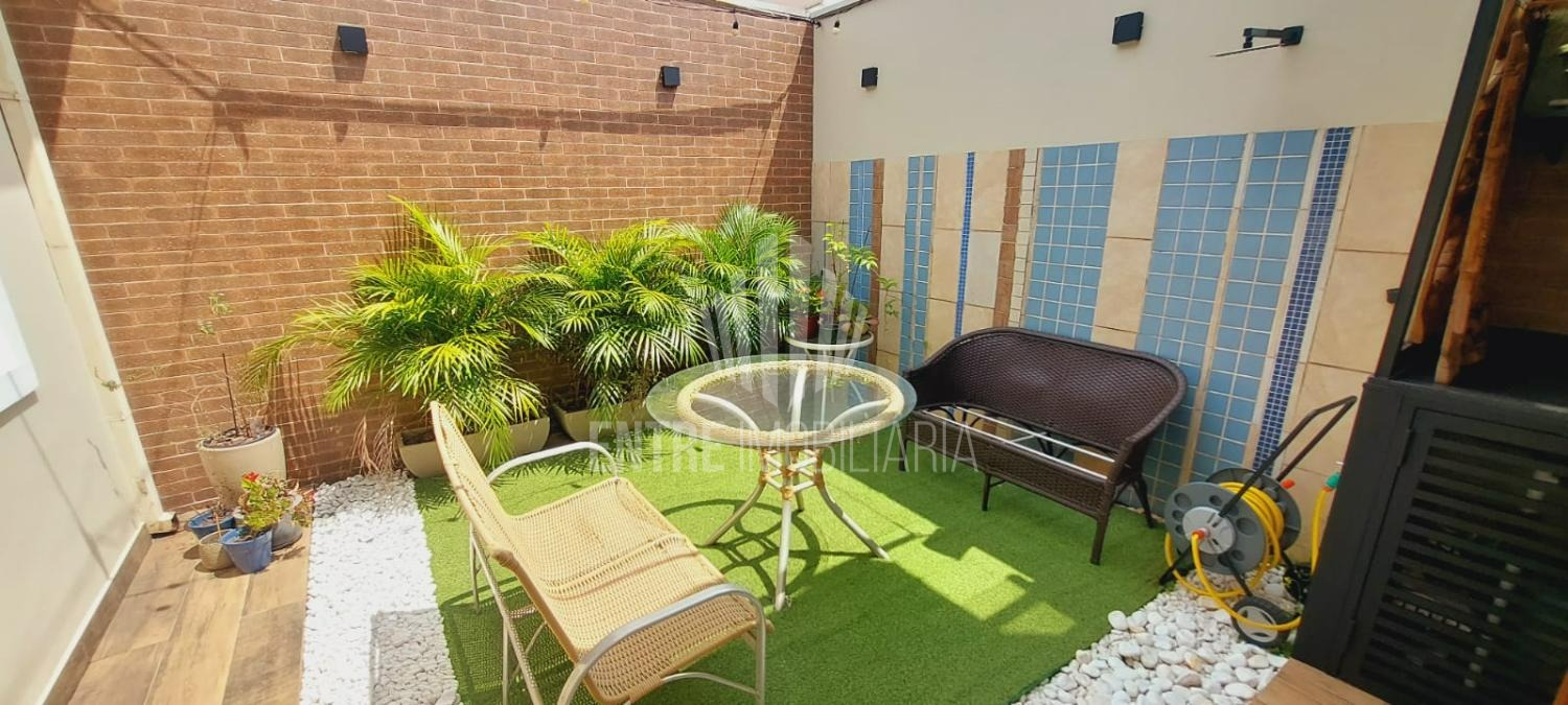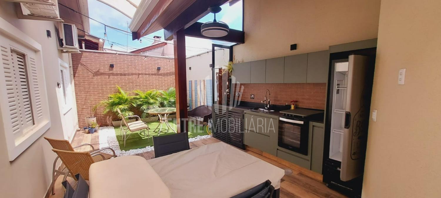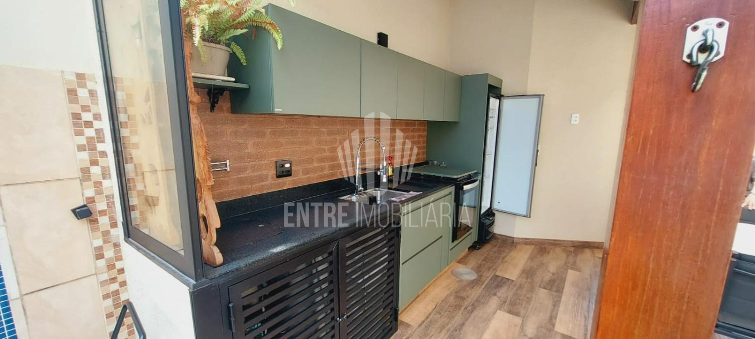 Nos fundos, um espaço gourmet completo com fogão, pia, armários e cervejeira, além de uma área decorada com mesa e plantas, ideal para momentos de convivência.