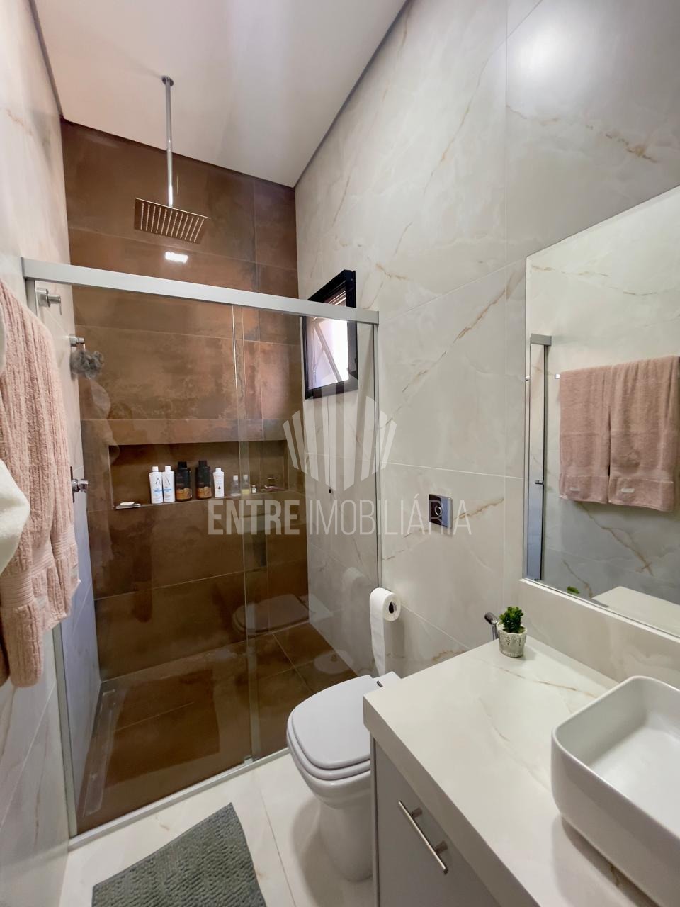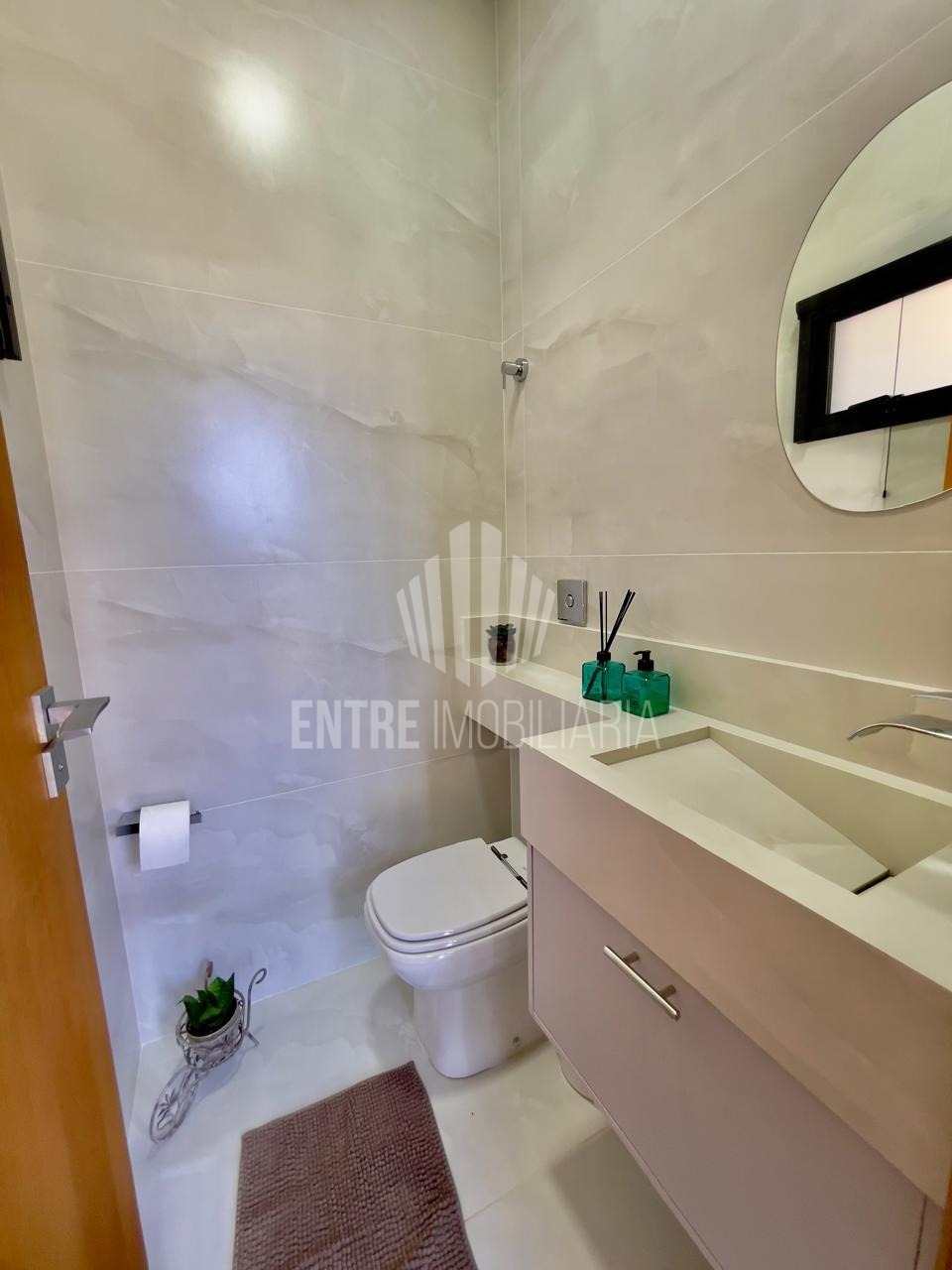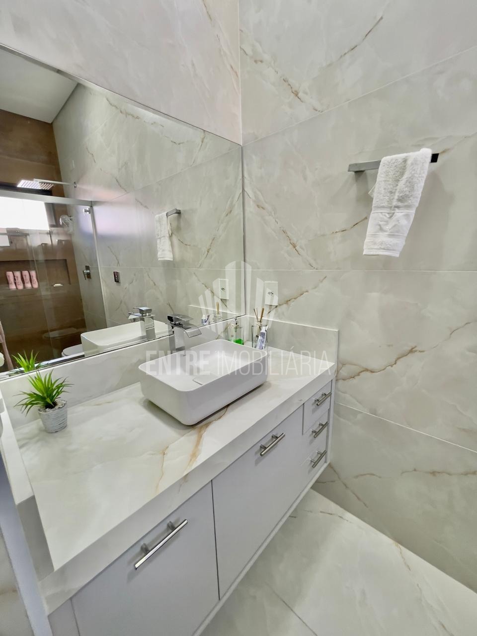 O requintado acabamento em porcelanato realça a beleza dos ambientes, enquanto o sistema de aquecimento solar complementa a eficiência energética.