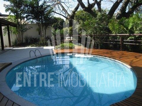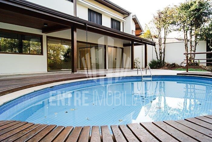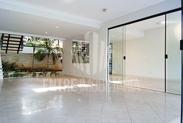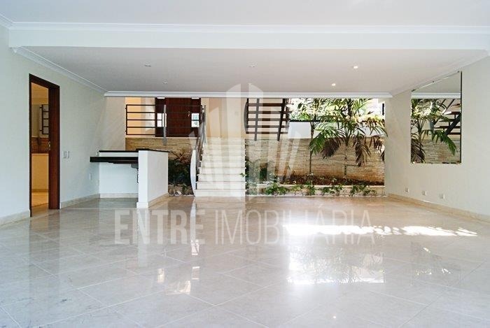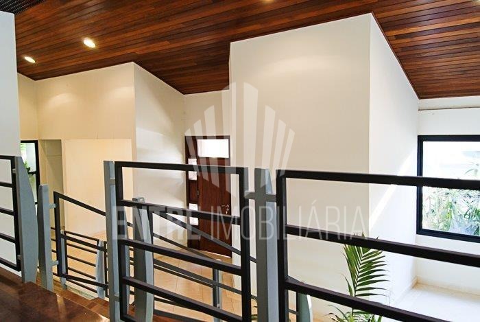 Casa muito bem projetada. No térreo possui, sala de estar, sala de jantar, lavabo, sala de leitura, escritório, home theater, cozinha planejada, copa, dispensa, área de serviço com armários planejados, suíte para empregada, terraço, churrasqueira, piscina, banheiro da área lazer externa, garagem para quatro carros cobertos, entrada de serviço, entrada principal, duas entradas independentes para a piscina.