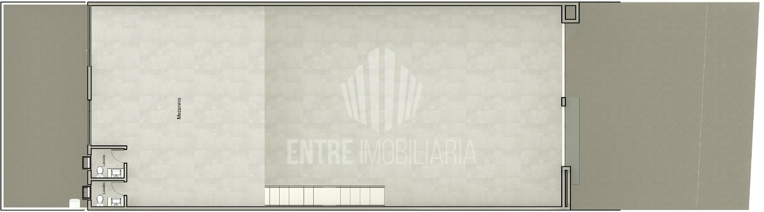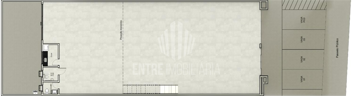 O projeto contempla 2 banheiros e copa no pavimento térreo, além de mais 2 banheiros no mezanino, garantindo conforto operacional para diferentes atividades comerciais.